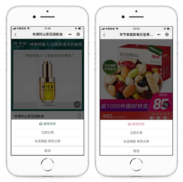 ??在微盟后臺開通「好物圈」功能以全國休閑食品巨頭企業百草味為例,用戶在線下通過微信「掃一掃」掃描百草味爆款商品「牛肉干」的包裝袋之后,微信的識物能力會顯示出該商品的價格信息、相關資訊以及商品介紹,點擊商品之后直接進入小程序商城完成購買。