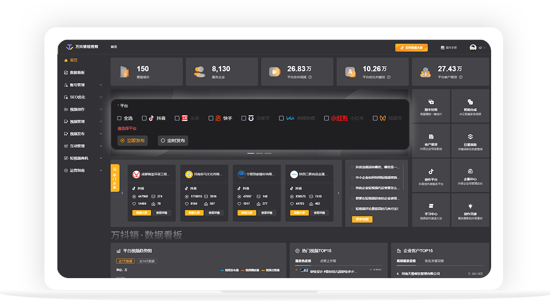 整合多個頭部平臺,抖音、快手、頭條、西瓜、B站、小紅書、視頻號視頻全網分發,一鍵智能發布,省時省心省力,
